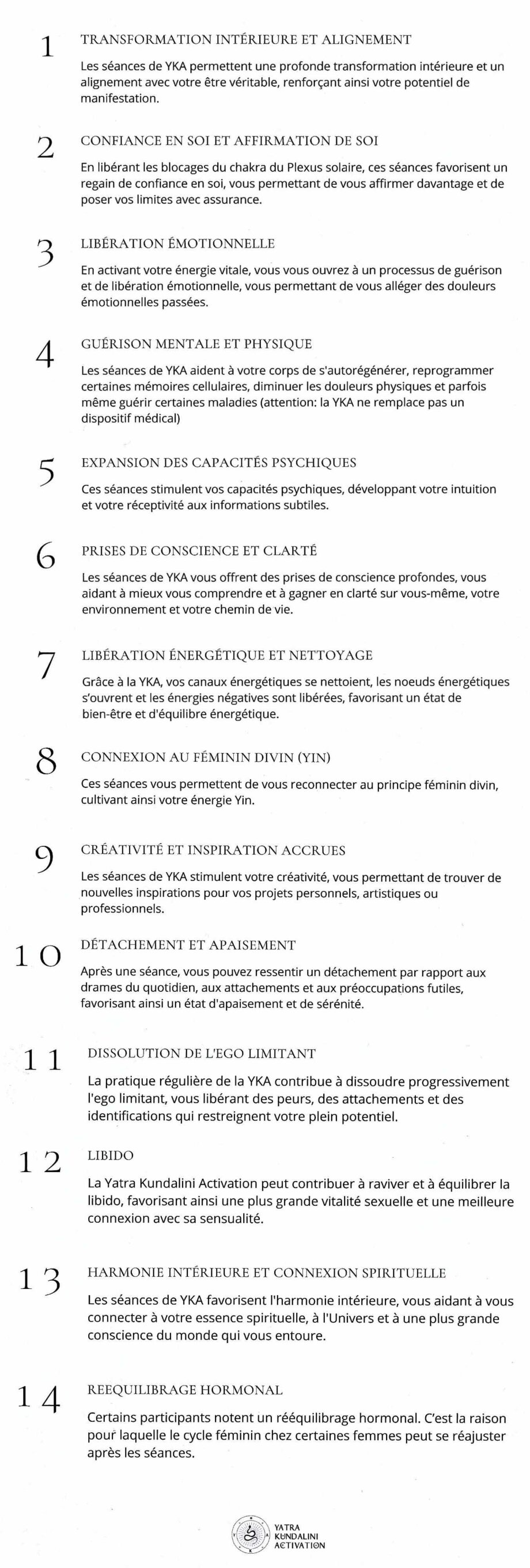 Les séances de Yatra Kundalini Activation ont de très nombreux bienfaits, physiques, psychiques, émotionnels et énergétiques.